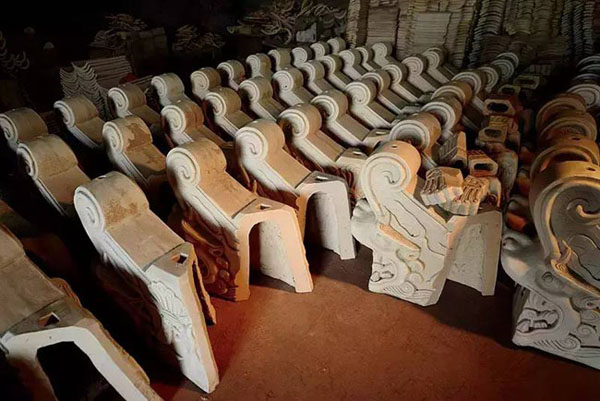 官式建筑琉璃瓦要經(jīng)過二次燒成,原料精純的坯胎第一次燒出的顏色呈微黃的白色,這樣可以最好地呈現(xiàn)出釉料色澤的純凈。圖中這組吻獸構(gòu)件剛結(jié)束第一次的燒制,等待施釉重生。
