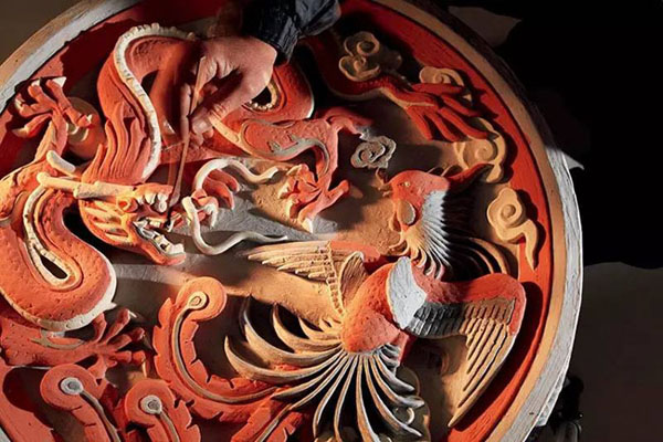 琉璃制品中,常常會有用于影壁等處的大型裝飾構(gòu)件。這張龍鳳大盤工藝精致,用色多達(dá)七種,有龍身的黃、背景的綠、靈芝的紫、祥云的白、鳳翅羽的藍(lán)、鳳頸的孔雀藍(lán)、鳳眼的黑。最奇妙的是,施釉前的顏色(上圖)與燒成的顏色(下圖)完全不同,讓人對傳統(tǒng)工藝的神奇變化油然而生敬佩之心。